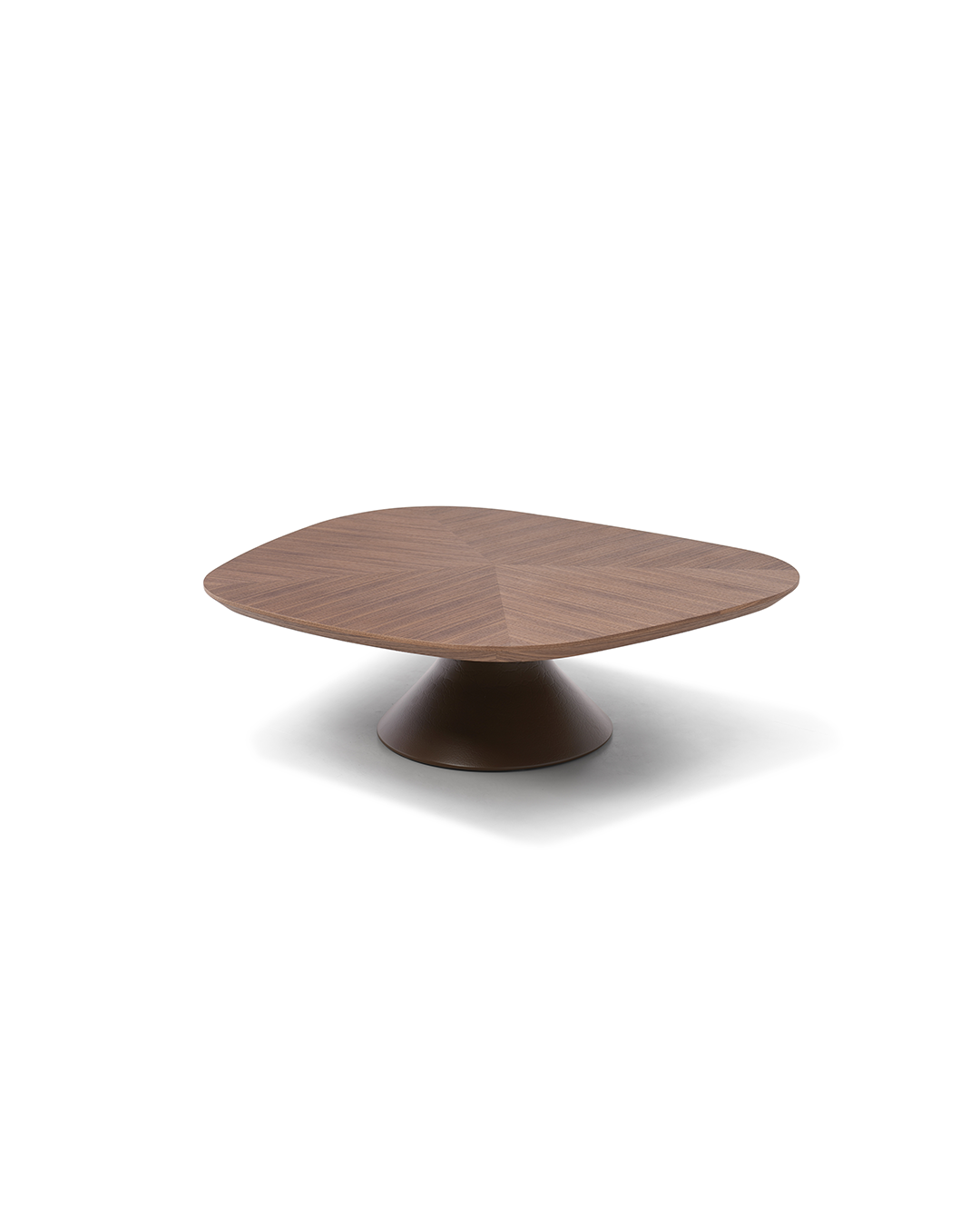 שולחן סלון בעיצוב נקי עם פלטה מרובעת־מעוגלת עשויה פורניר אגוז בגימור טבעי. חלוקת העץ יוצרת טקסטורה עדינה ומראה חמים.