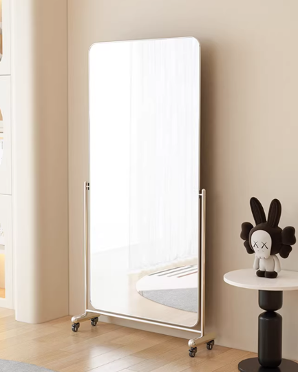 מראה עם מסגרת מתכתית דקה ומינימליסטית. עומדת על גלגלים לניידות קלה ונוחה, ומאפשרת הזזה בין חללים בהתאם לצורך. מראה פונקציונלית ואלגנטית שמתאימה לחדר שינה, חדר ארונות או פינת סטיילינג, ומשתלבת בקלות בכל סגנון עיצוב.ֿ