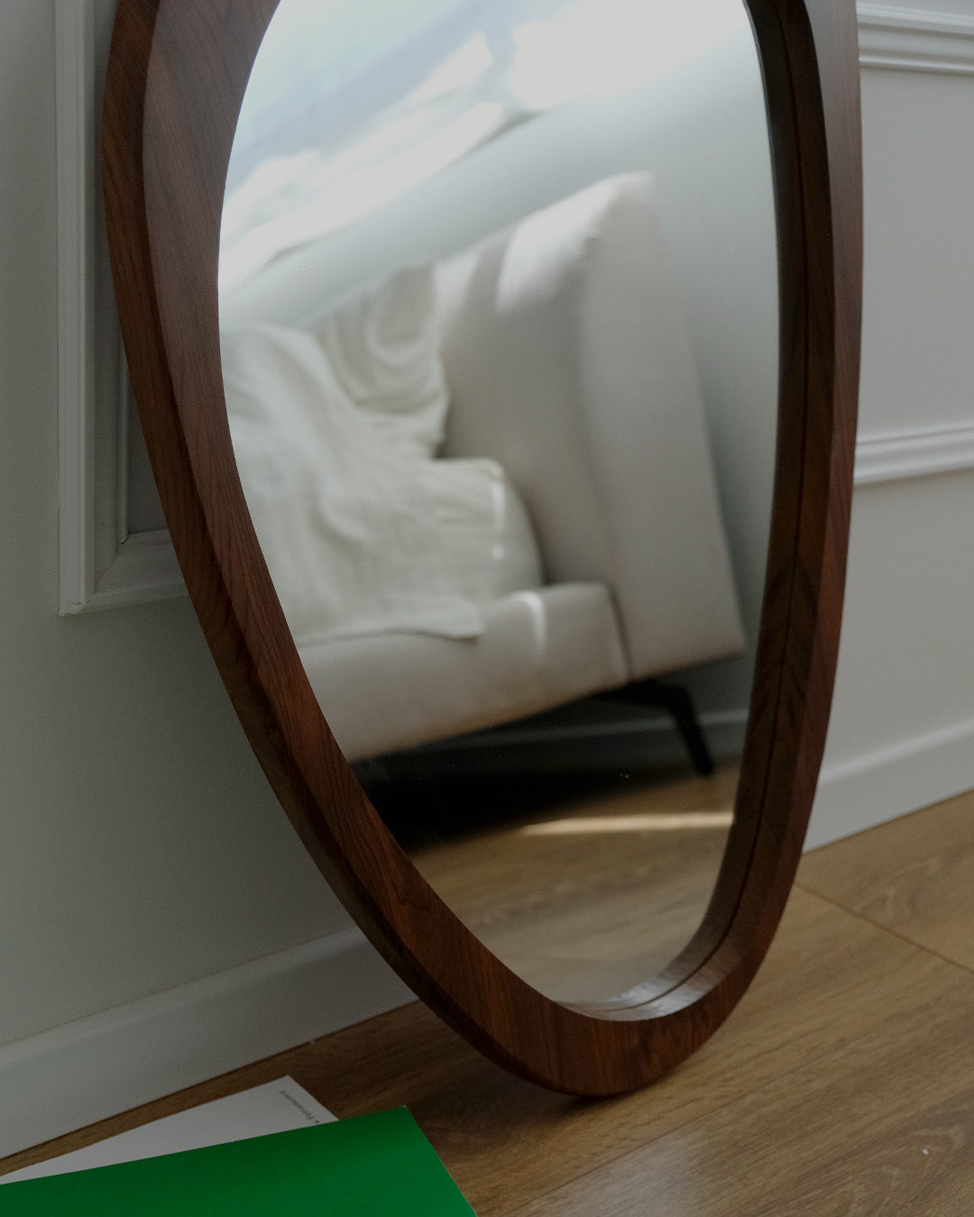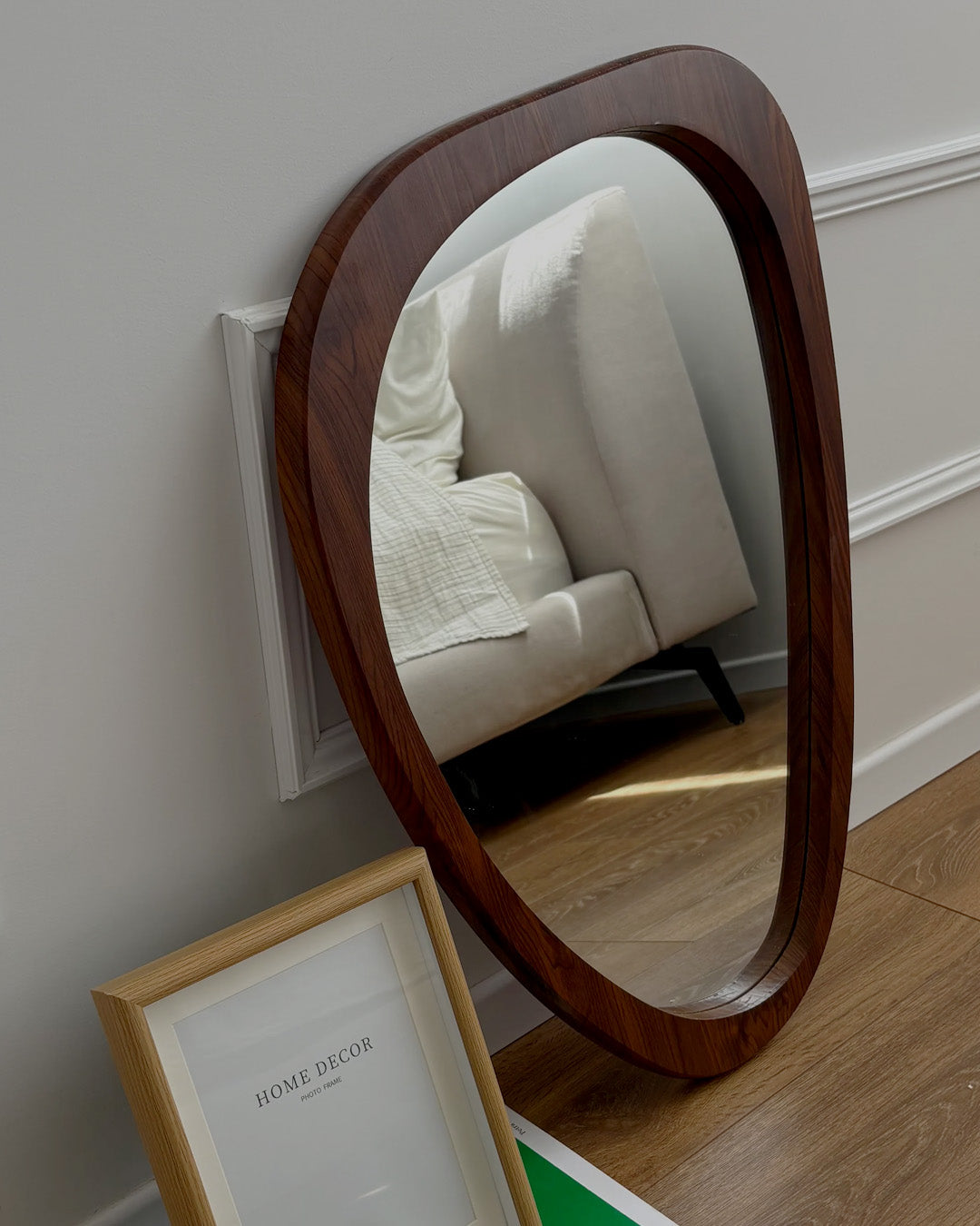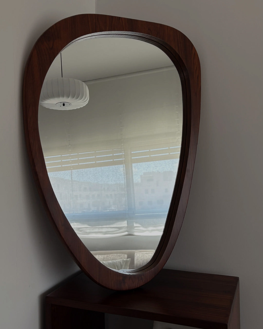 מראה עם אופי – מראת ORGANIC בגוון עץ אגוז מגיעה בעיצוב לא סימטרי, שמכניס עניין ותחכום לכל קיר. הקווים הרכים, הצורה הייחודית והגימור החם יוצרים פריט דקורטיבי שהוא גם פרקטי וגם יצירתי