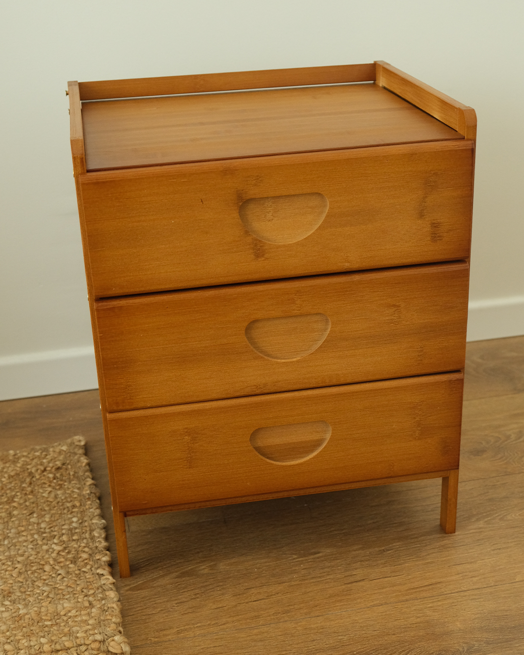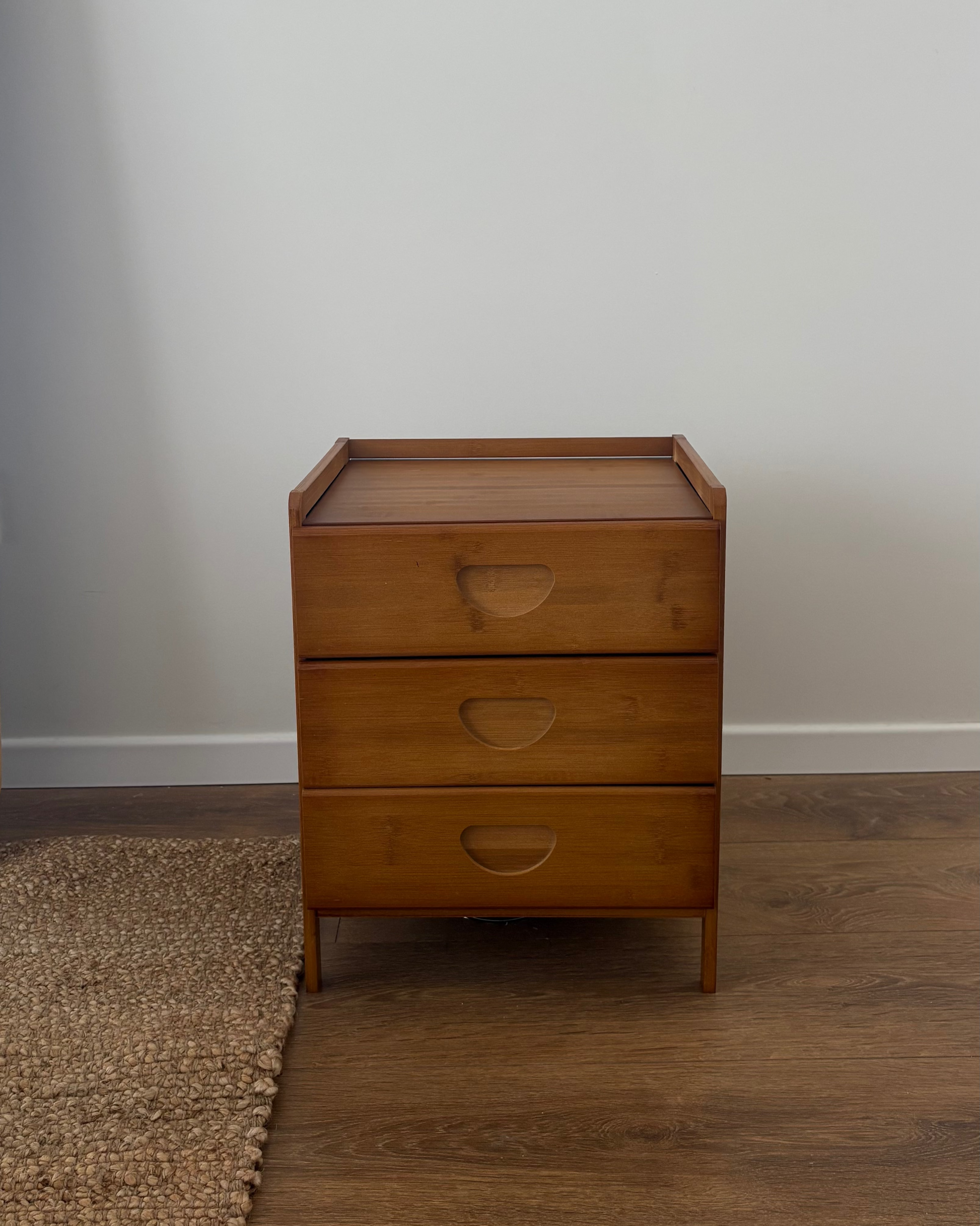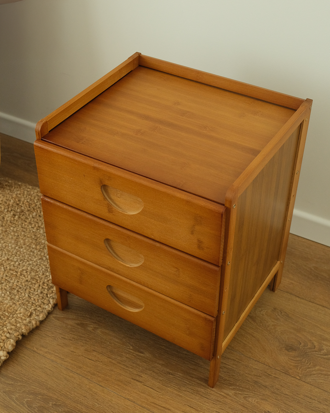 שידת לילה בעלת עיצוב נקי וקווים ישרים, עם שלושה מגירות נוחות לאחסון.