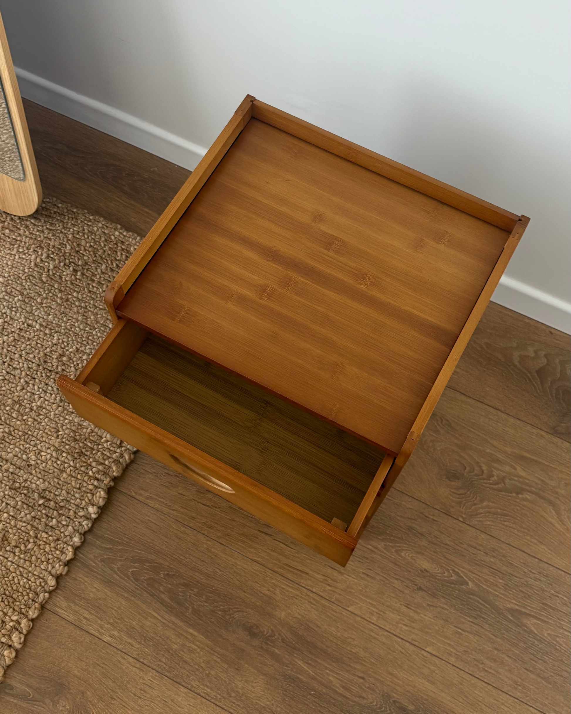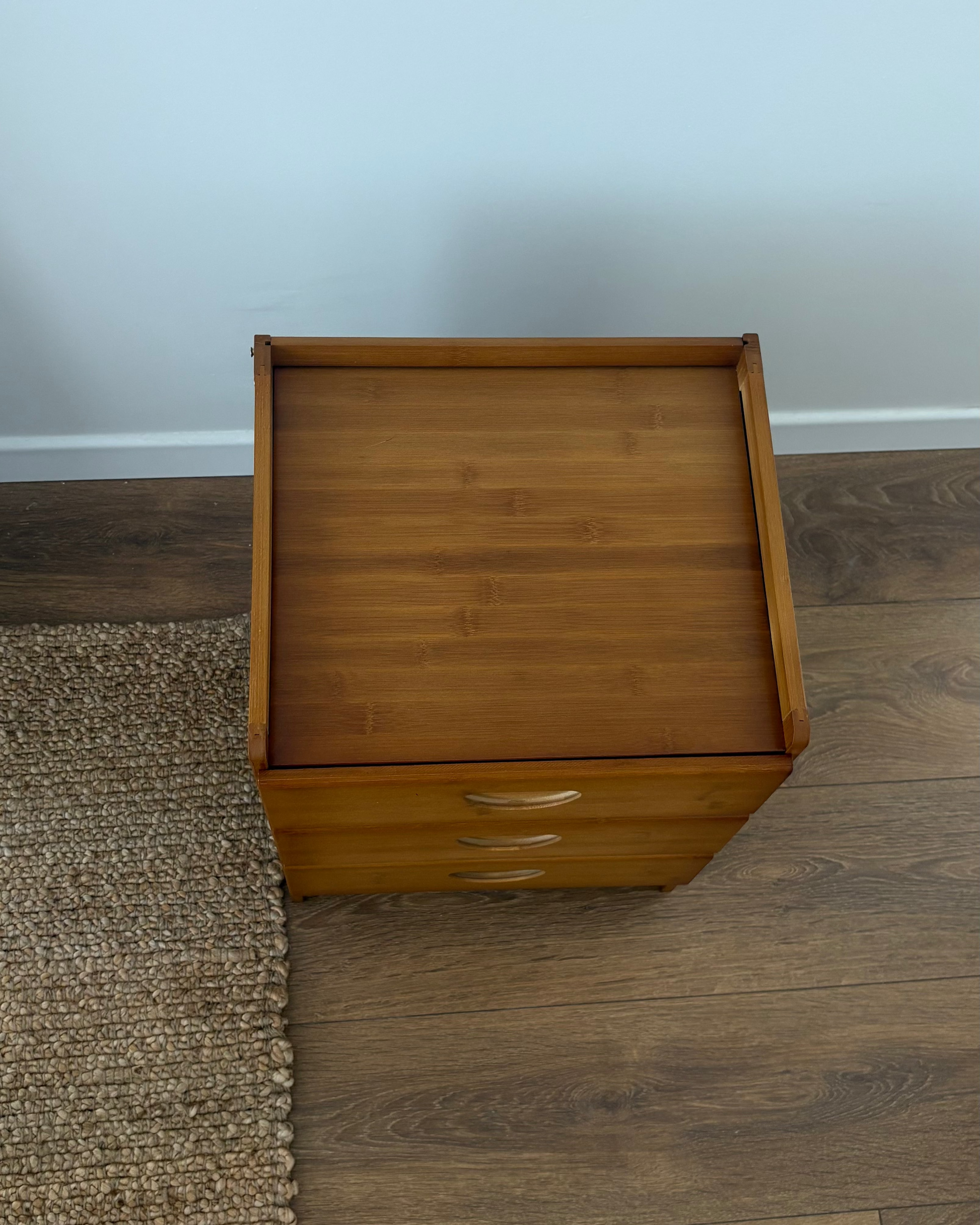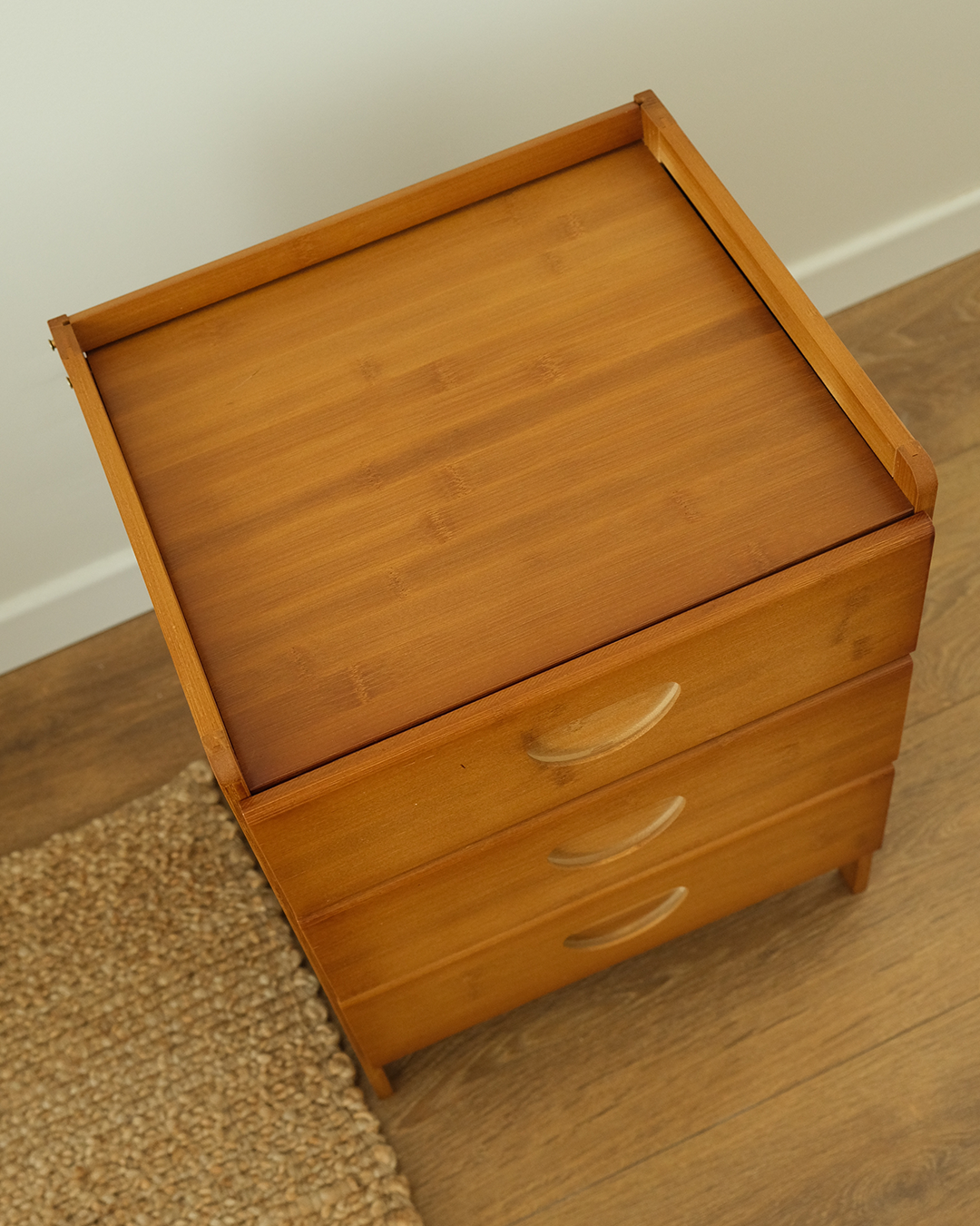 שידת לילה בעלת עיצוב נקי וקווים ישרים, עם שלושה מגירות נוחות לאחסון.