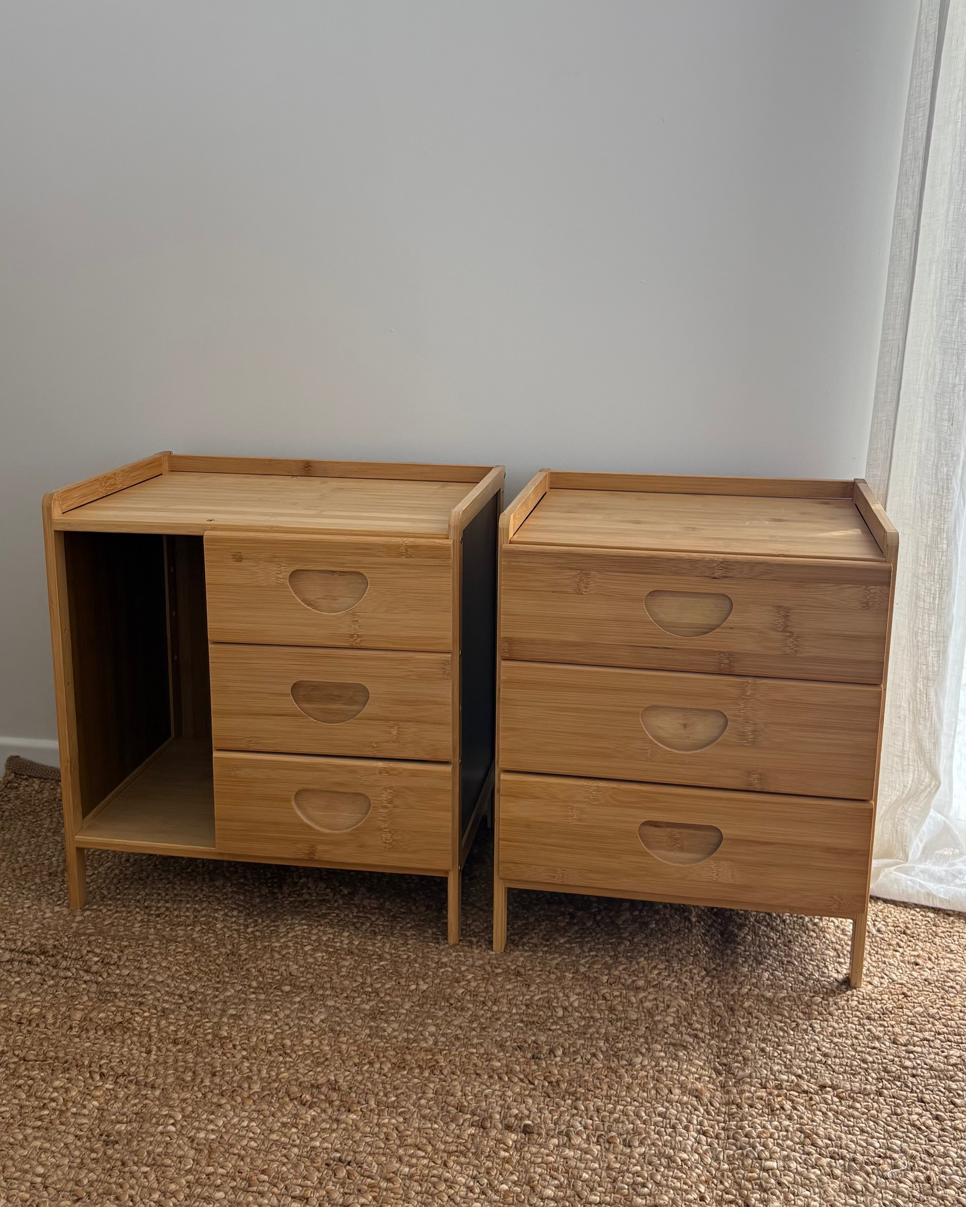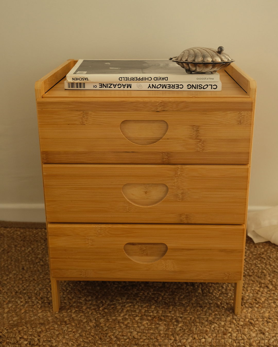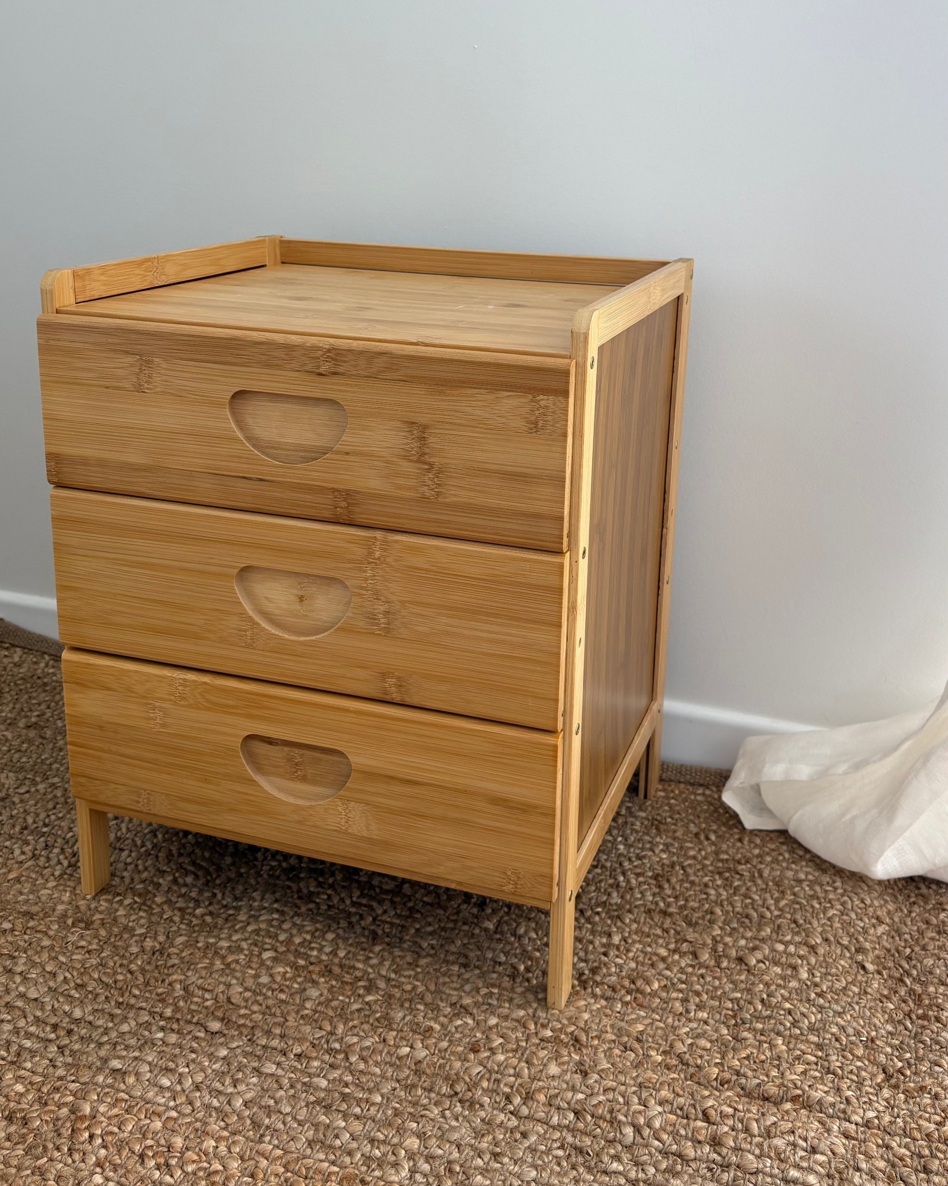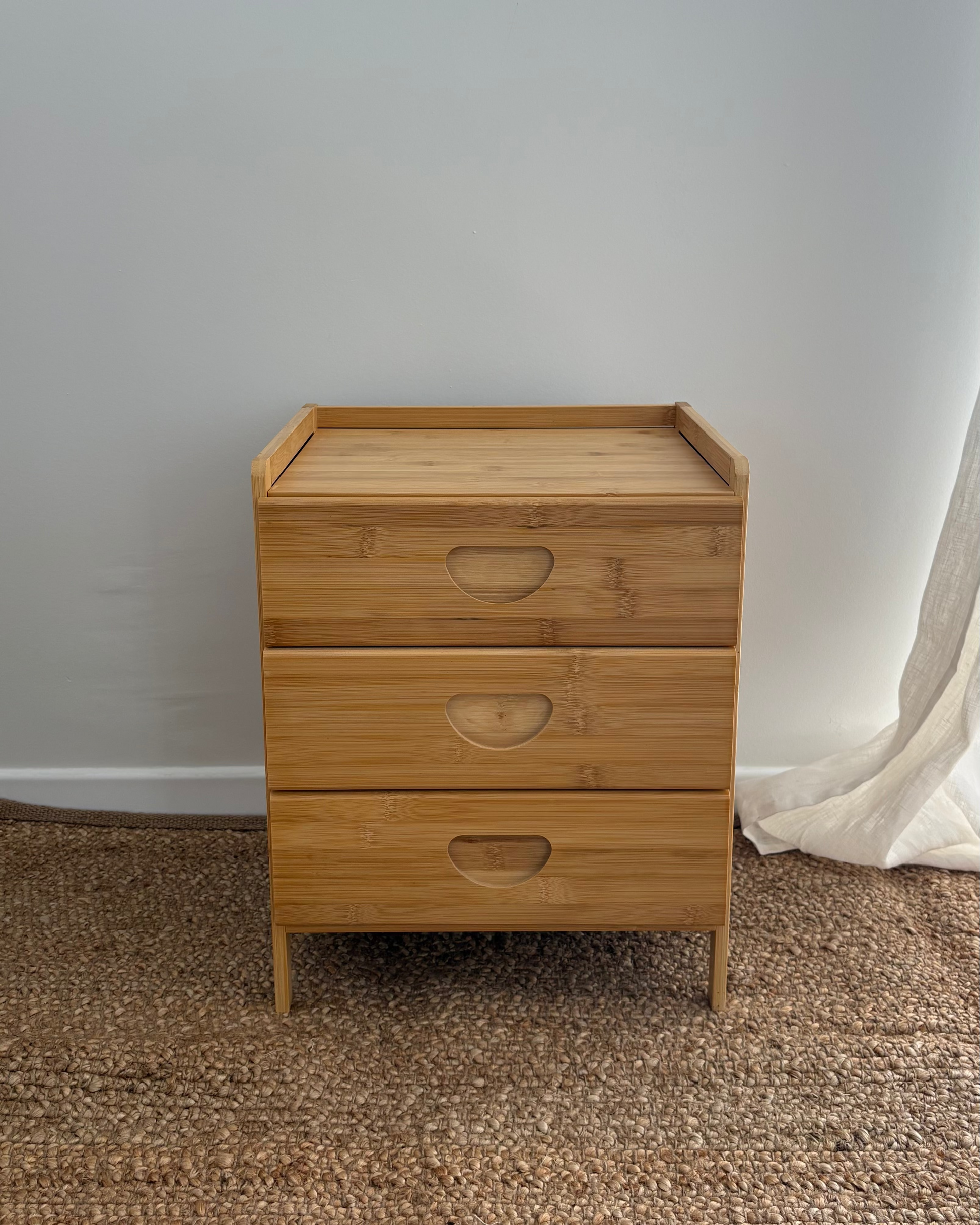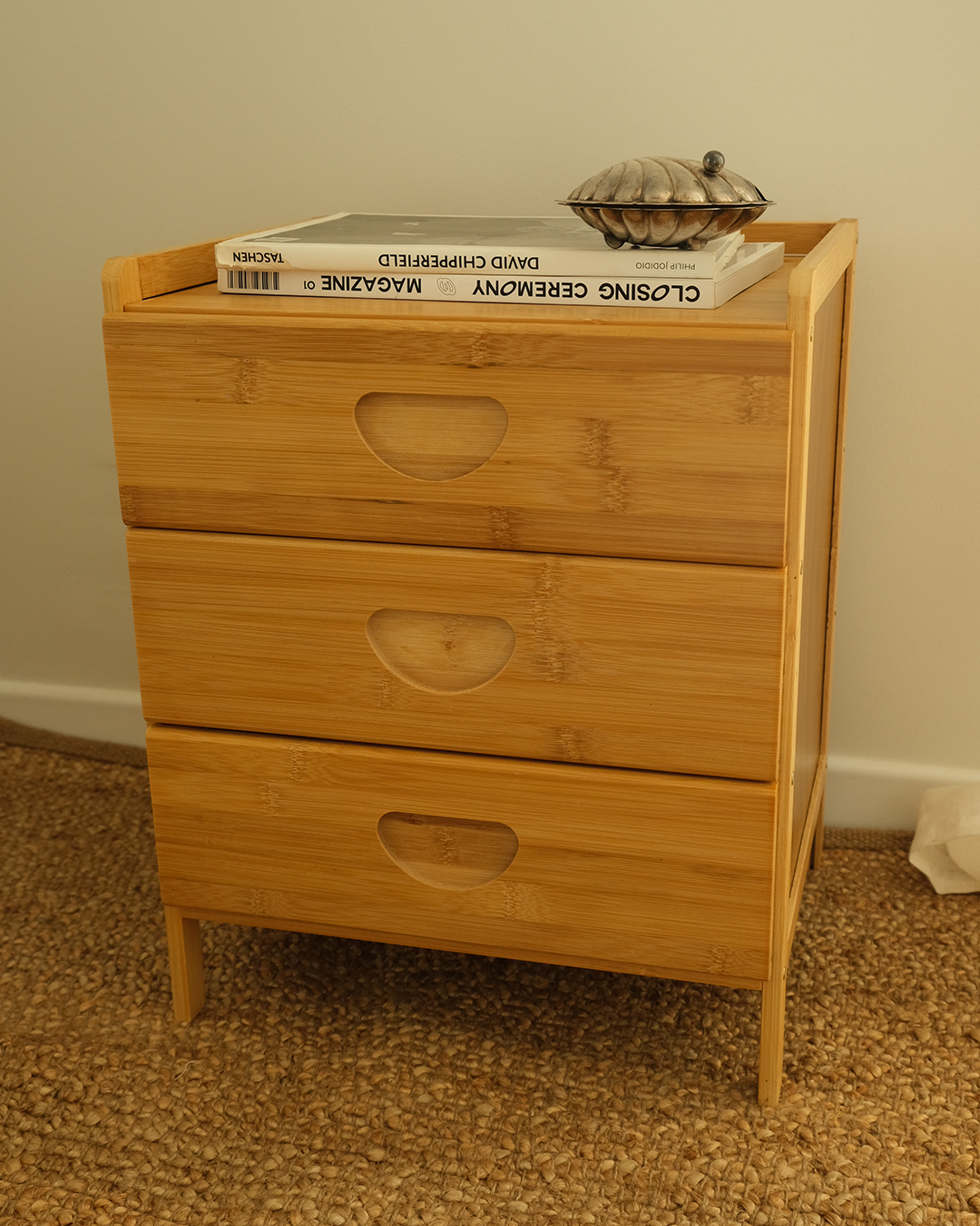 שידת לילה בעלת עיצוב נקי וקווים ישרים, עם שלושה מגירות נוחות לאחסון.