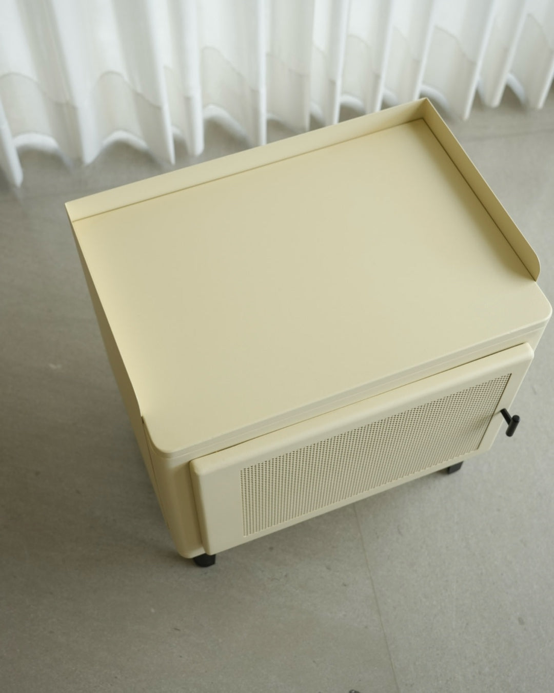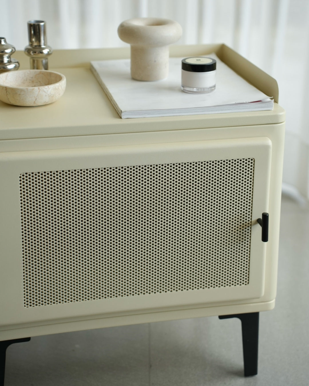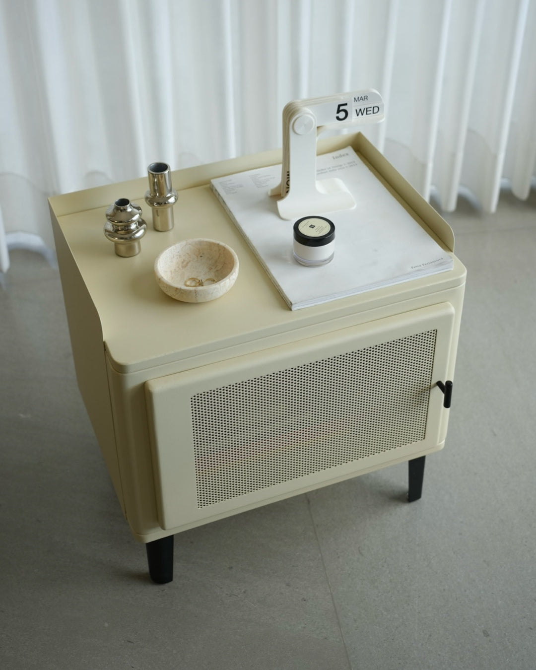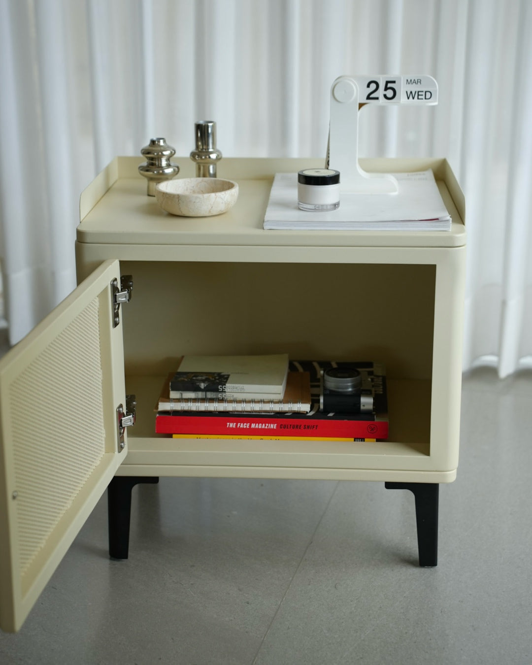 שידת אחסון קומפקטית עם קווים מעוגלים ועיצוב נקי. גוף השידה בהיר ובעל פינות רכות, עם דלת קדמית הכוללת חזית קלועה שמוסיפה טקסטורה וחמימות למראה הכללי.
