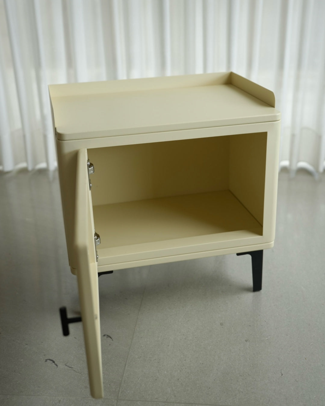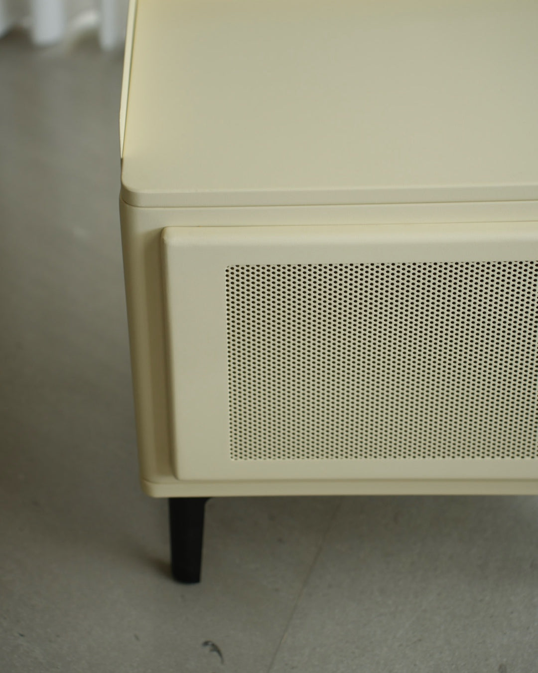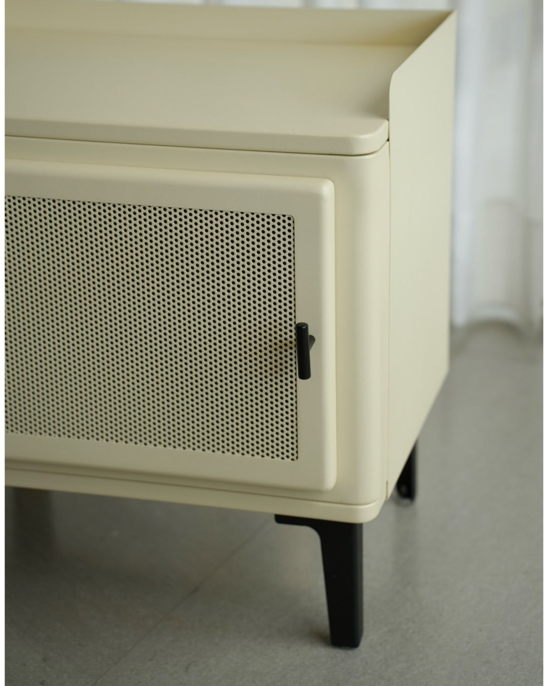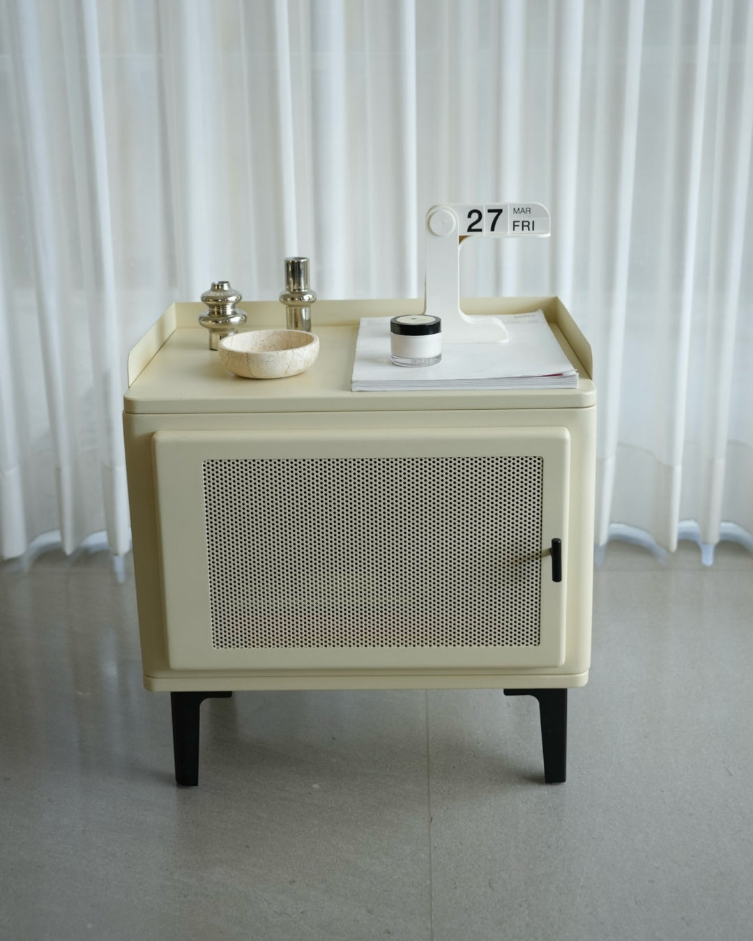 שידת אחסון קומפקטית עם קווים מעוגלים ועיצוב נקי. גוף השידה בהיר ובעל פינות רכות, עם דלת קדמית הכוללת חזית קלועה שמוסיפה טקסטורה וחמימות למראה הכללי.