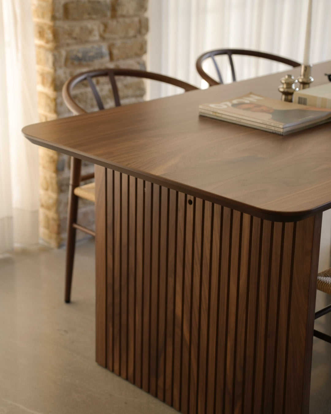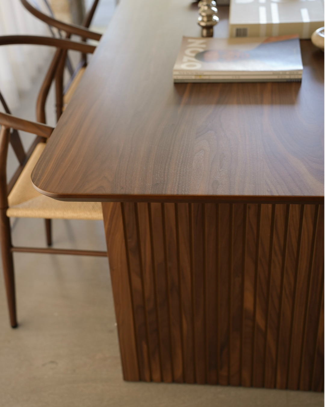בסיס השולחן מעוצב כקוביות מאסיביות משני הצדדים, כאשר אחת מהן משלבת חיפוי פסים אנכיים עדינים היוצרים עומק ועניין עיצובי. השילוב בין הפלטה המעוגלת בעדינות לבין בסיס השולחן האדריכלי מעניק מראה מודרני אך על־זמני.