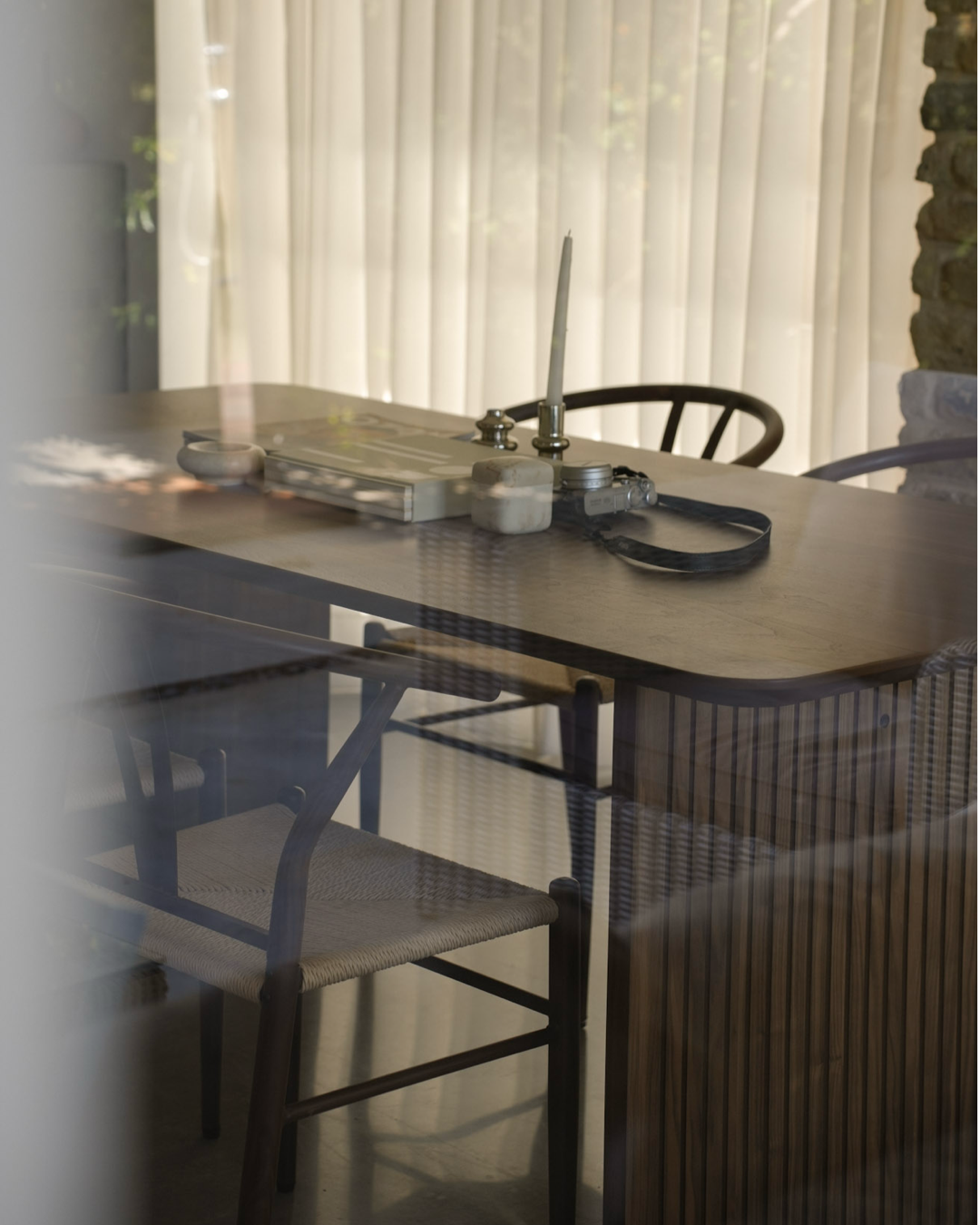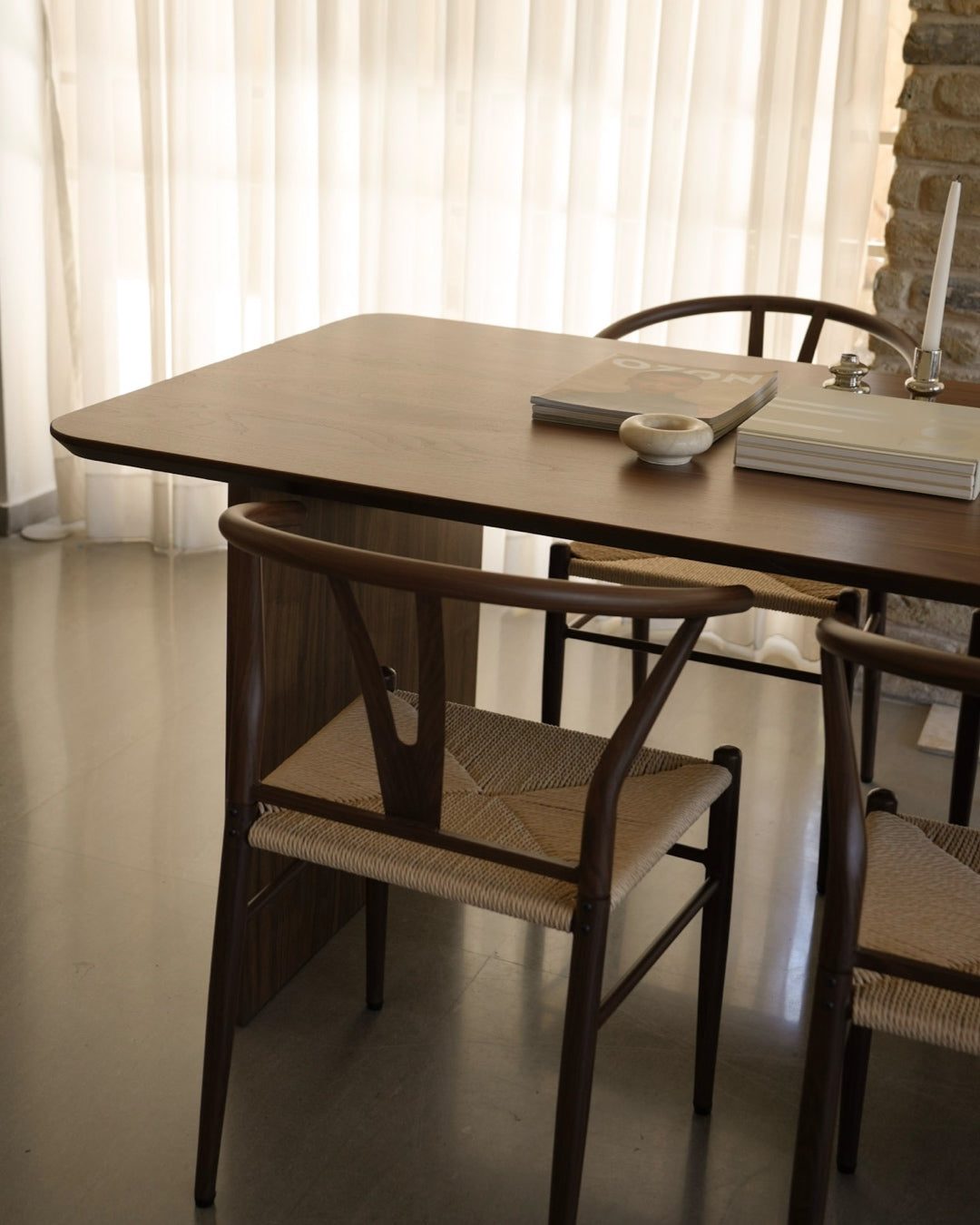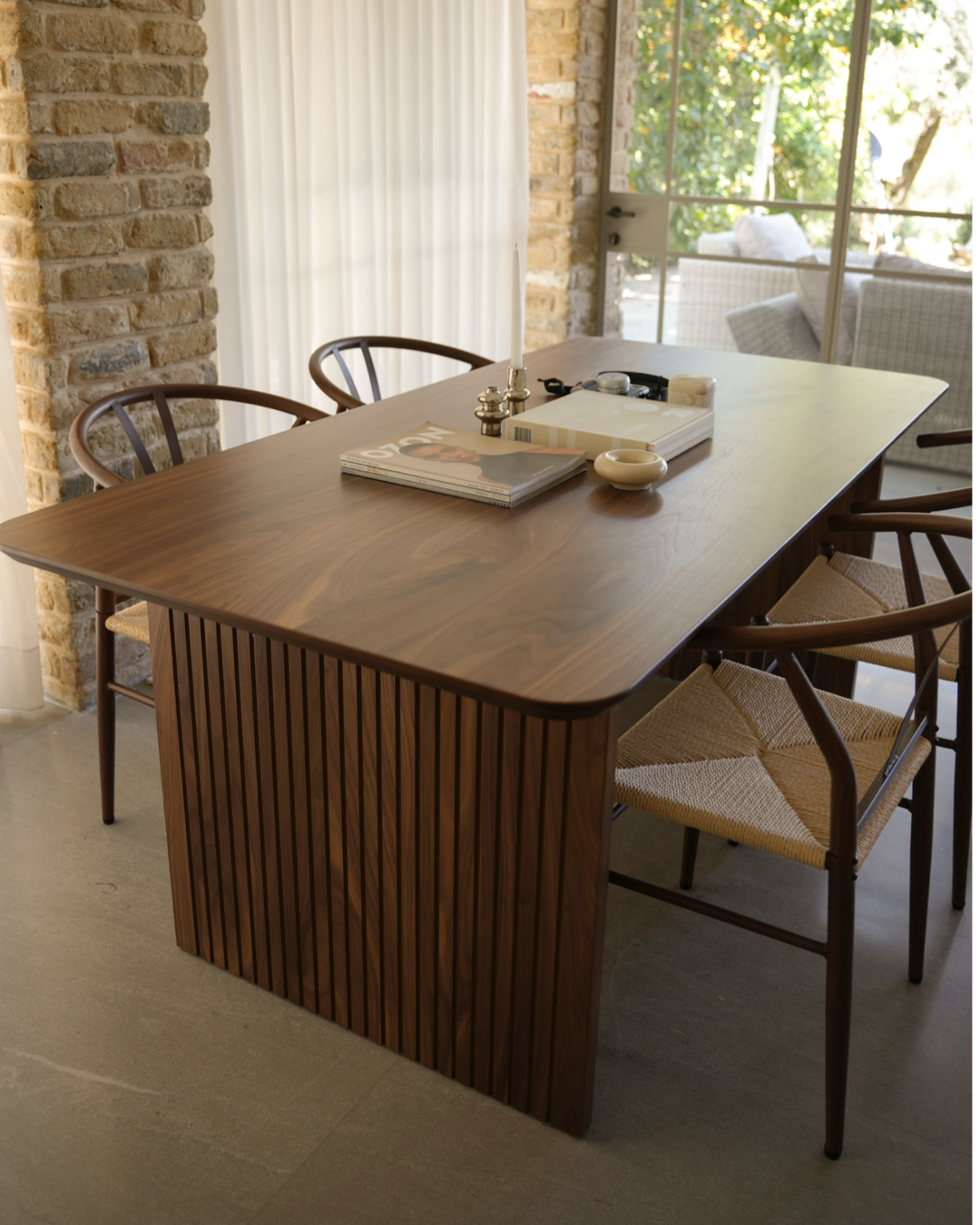 שולחן אוכל בעל נוכחות עיצובית ייחודית המשלבת חמימות טבעית עם קווים מודרניים ונקיים. פלטת השולחן עשויה פורניר עץ אגוז, המדגיש את טקסטורת העץ העדינה ומעניק לחלל תחושה חמה, מוארת ואלגנטית.